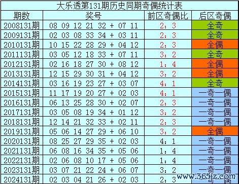后永诀析:在第131期历史同时开奖中,后区奖号奇偶比为17:17,最近5年同时后区奇偶走势为:一奇一偶、一奇一偶、一奇一偶、一奇一偶、一奇一偶,本年同时看好再出一奇一偶组合,祥和号码03、06。